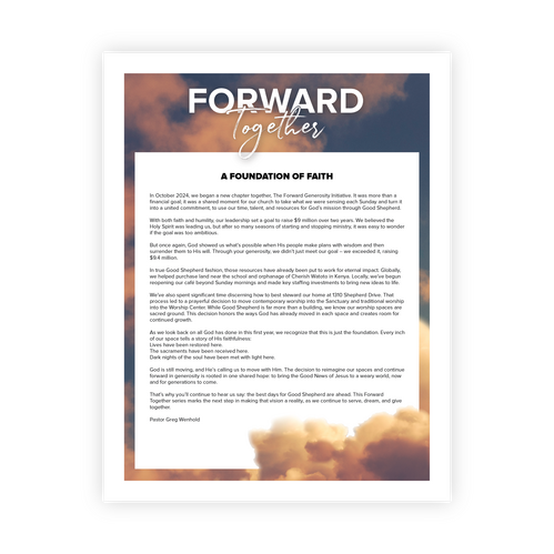 Just like our regular giving, we are asking people to generously respond to the full FORWARD vision over the next two years through our FORWARD fund. Our leadership has been entrusted with the responsibility of prioritizing spending on the new initiatives and management of the funds and will do so with great care and stewardship of the resources that are given. Please reach out to Tom Anderson, Operations Executive Director, at tanderson@goodshepherd-naperville.org if you have additional questions or would like to discuss this further.